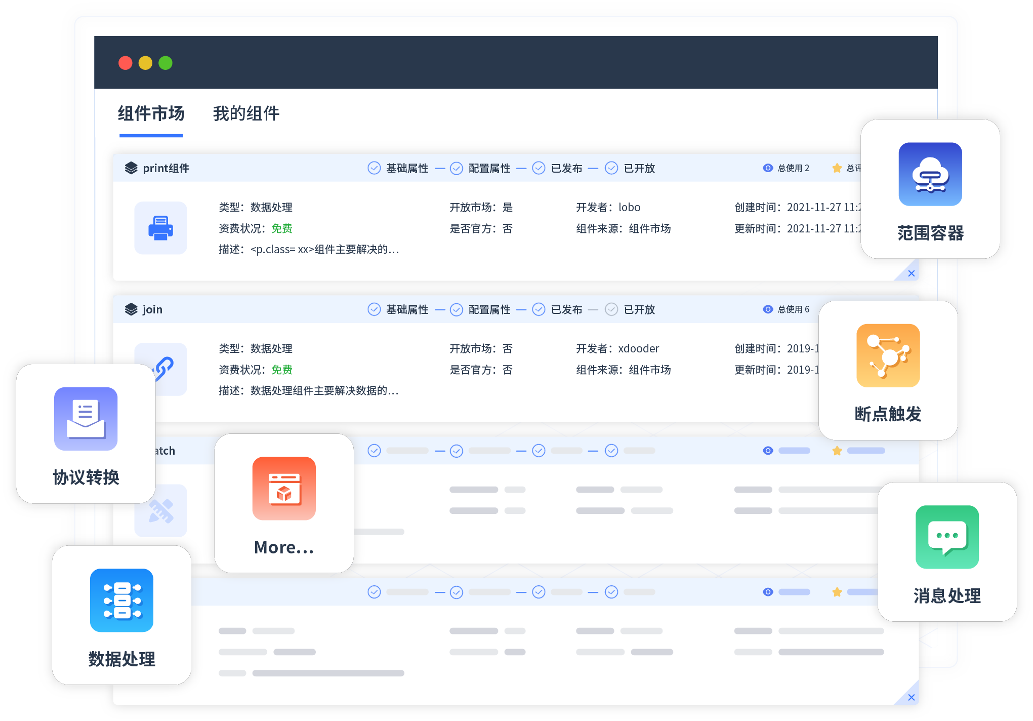 针对集成场景,,,,小米钱包提供组件市场,,,,例如协议转换、、、、消息处理、、、文件操作等。。除平台提供的组件外,,,,客户可以自定义所需组件。。