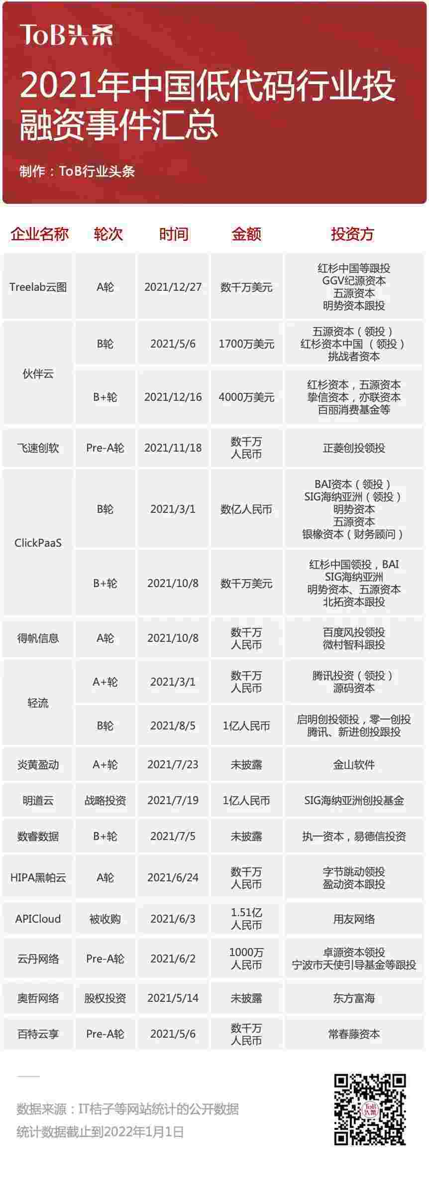 同期的国内市场同样战绩频频,,,,从2018-2020年,,,中国无/低代码领域总体投融资事件共16起。。。。