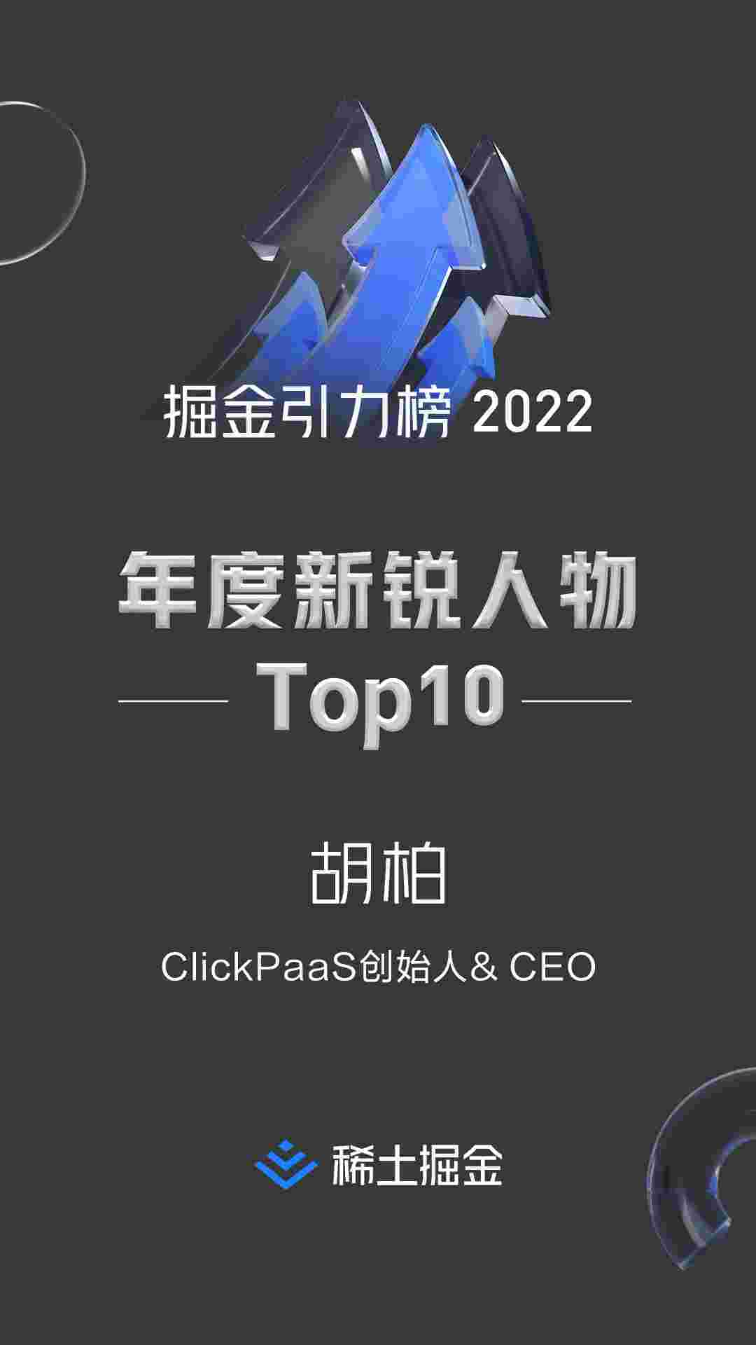 2022年1月6日,,稀土掘金社区第一届「掘金未来大会」成功举办,,,,会上发布了“2022 稀土掘金引力榜 年度新锐人物”榜单,,上海爱湃斯科技有限公司(简称小米钱包)创始人及CEO胡柏实力入选年度新锐人物TOP 10。。。。