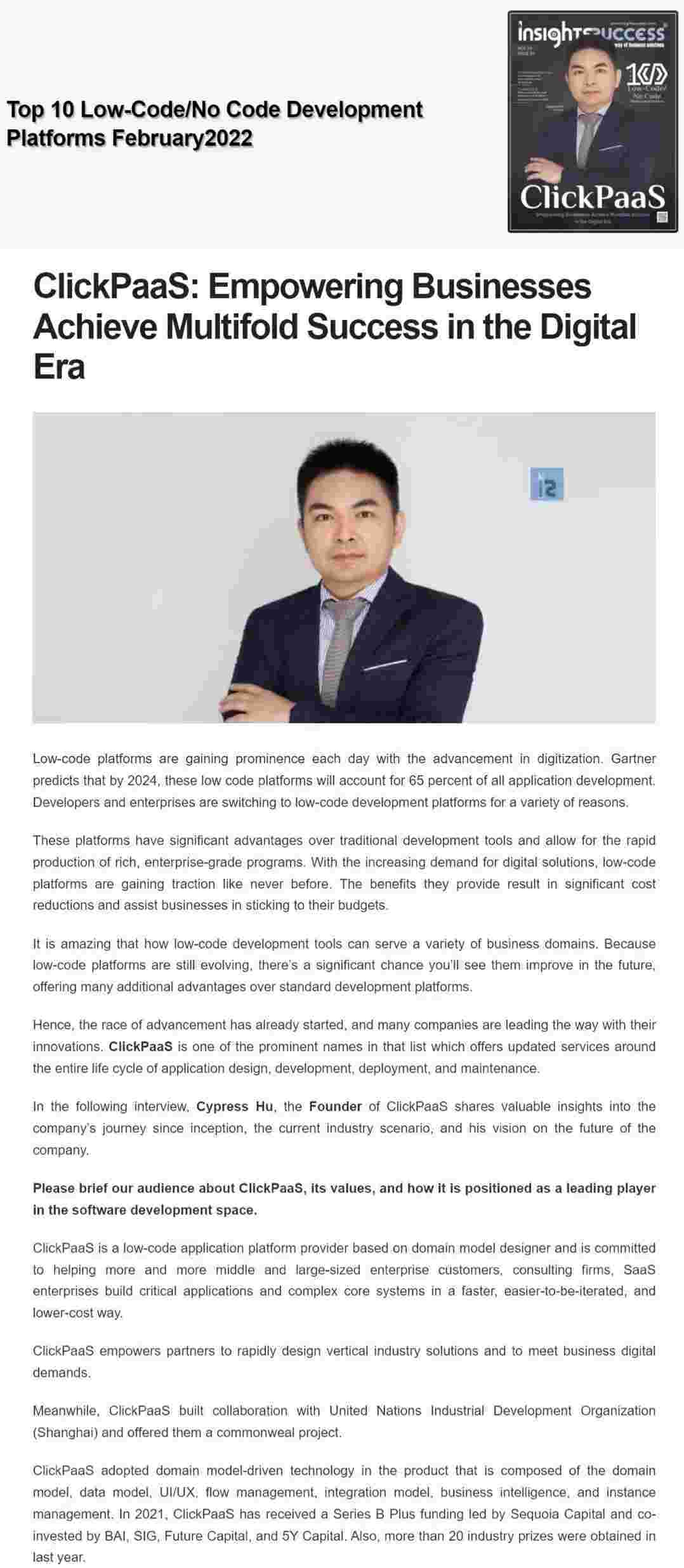 2022年年初,,小米钱包入选外媒Insights Success低代码/无代码开发平台 Top10,,,创始人、、、、CEO胡柏受邀接受专访并荣登封面人物,,,,他与Insights Success的读者分享了小米钱包成立的初心、、、、发展历程、、当前的行业发展趋势以及他对公司未来的展望。。。